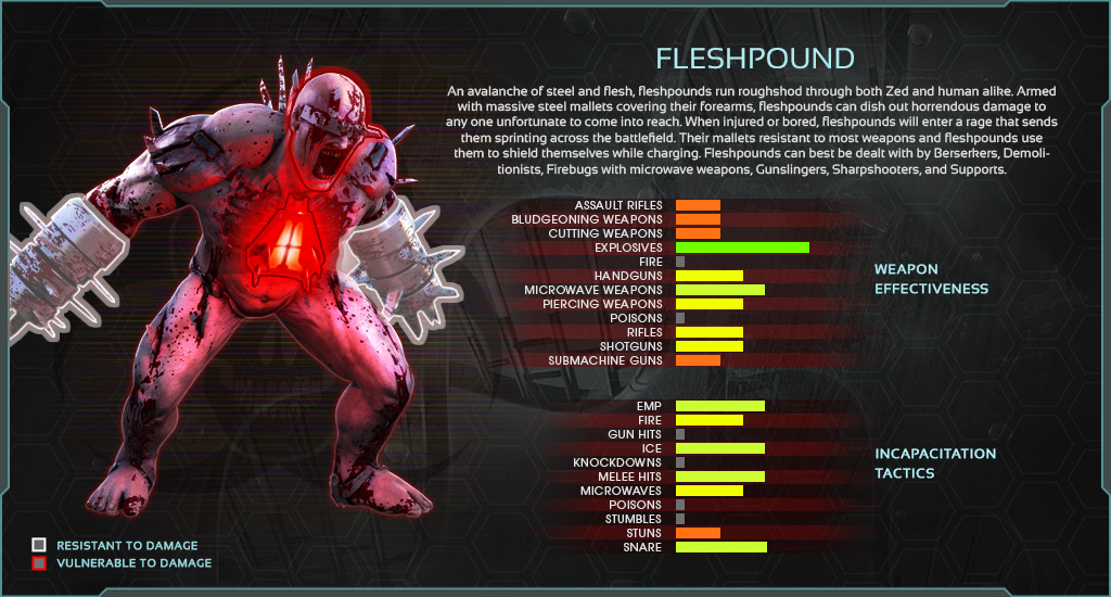 The fleshpound is a giant specimen in killing floor 2 it is classifed as a large enemy and is considered to be of extremely high threat.